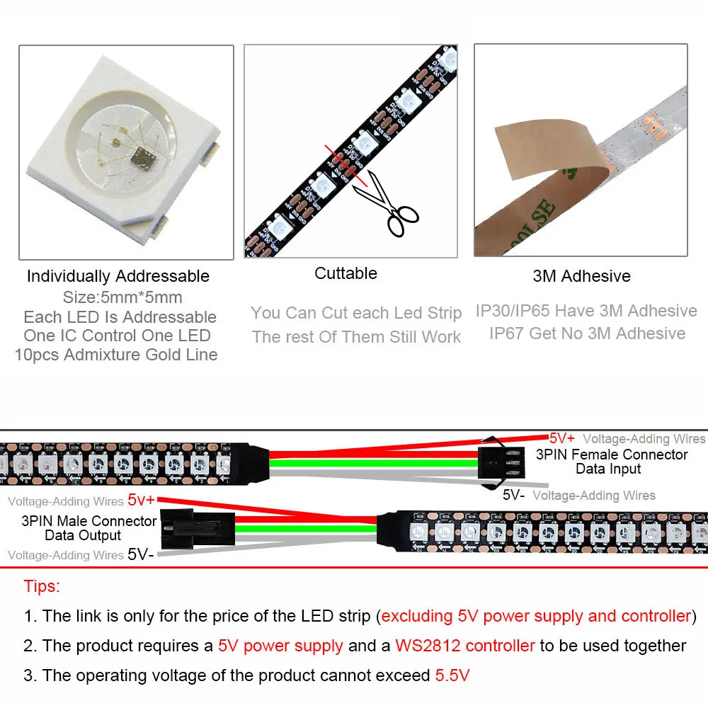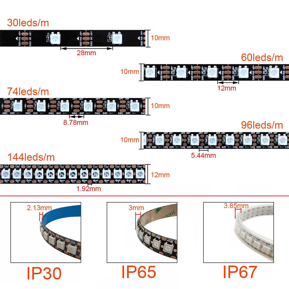 Fleksibel WS2812B LED-strip med individuelt adresserbare RGB-piksler, perfekt for kreative lysprosjekter, ambilight-oppsett, cosplay, smarthjem-belysning og Arduino/ESP32-prosjekter. Hver enkelt LED kan styres uavhengig med full RGB-fargekontroll, noe som gir deg uendelige muligheter for animasjoner, effekter og fargemønstre.